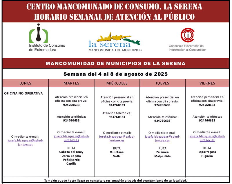 El servicio del Centro Mancomunado de Consumo de la Mancomunidad de Municipios de la Serena vuelve a la normalidad.